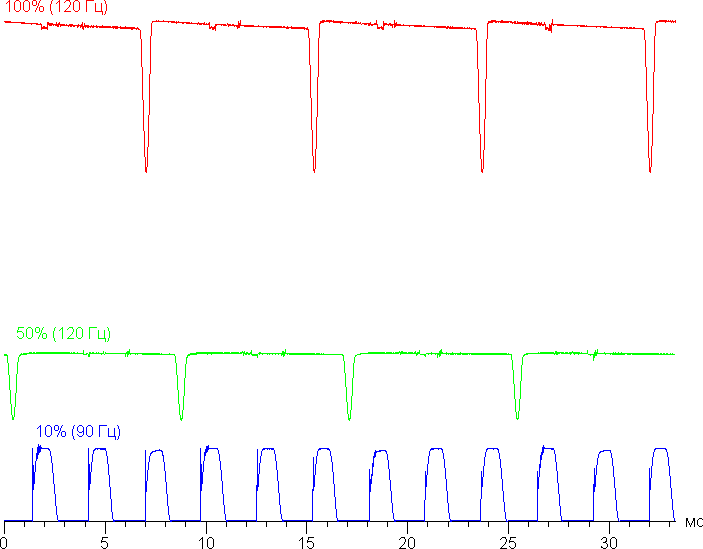 Частота модуляции на высокой и средней яркости увеличилась до 120 Гц (мерцание при этом не обнаруживается), а на низкой характер модуляции не изменился. Отметим, что на низкой яркости кадровая частота почему-то принудительно снижается до 90 Гц.