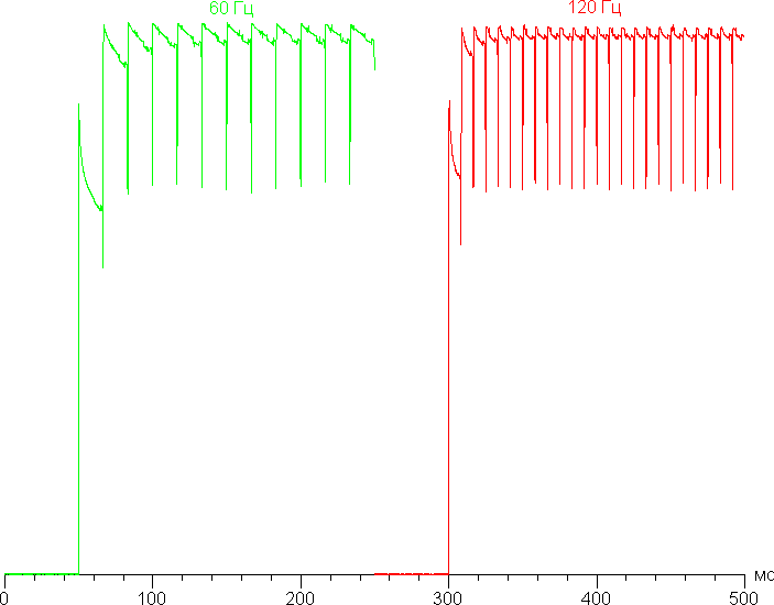 Переключение состояния элементов матрицы выполняется практически мгновенно, но на фронте включения (и реже — выключения) может присутствовать ступенька шириной примерно 17 мс (при частоте обновления экрана 60 Гц) или примерно 8 мс (120 Гц). Например, так выглядит зависимость яркости от времени при переходе от черного к белому и обратно: