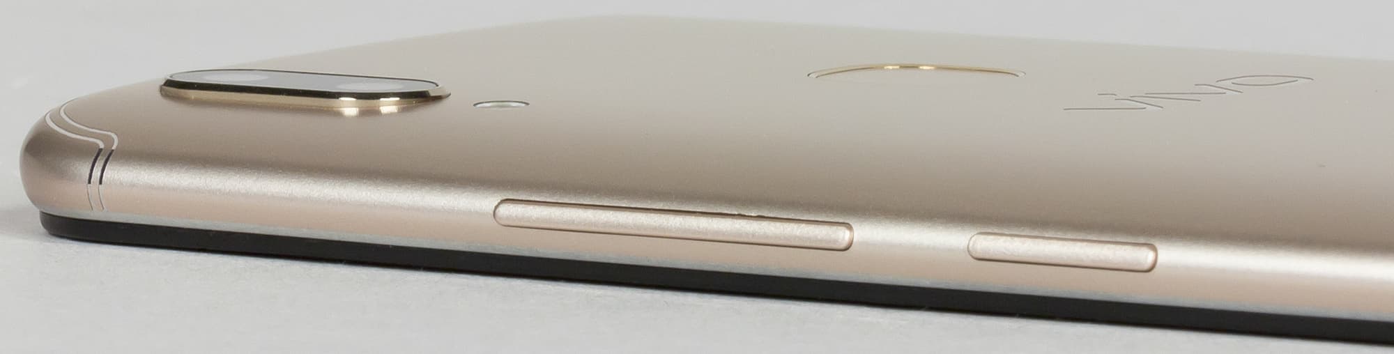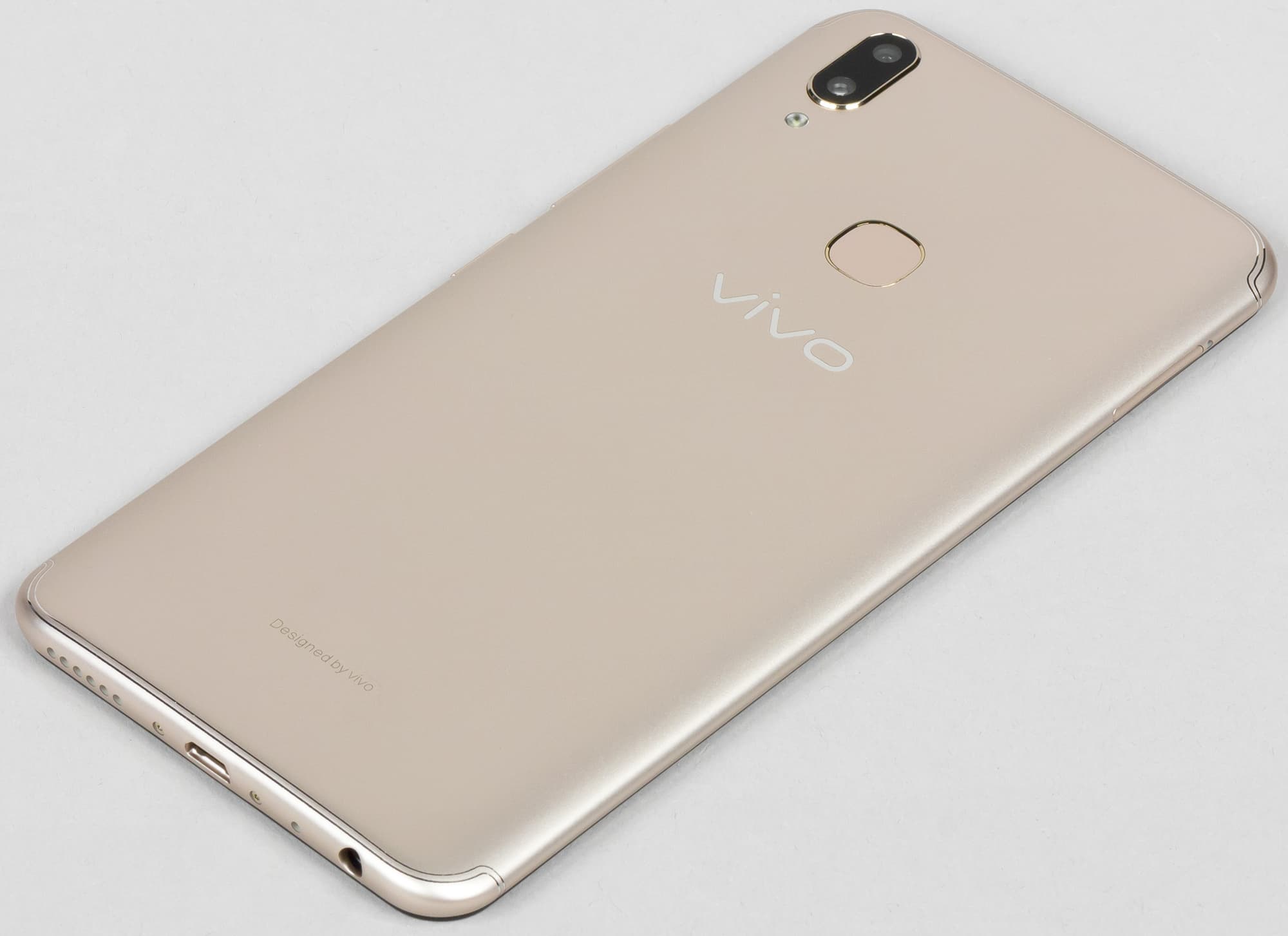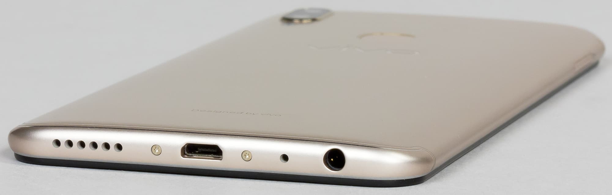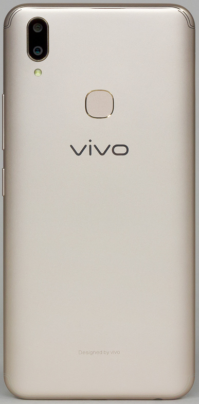 В продажу Vivo V9 поступает в двух цветовых исполнениях: перламутрово-черный и золотистый. Передняя панель в обоих случаях остается черной, но здесь любопытно другое: у золотистого варианта передняя панель матовая, а у черного — неожиданно глянцевая. Как следствие — у черного варианта корпус более маркий, отпечатки пальцев на нем видны лучше, чем на матовом золотистом. Влагозащиты смартфон не получил.