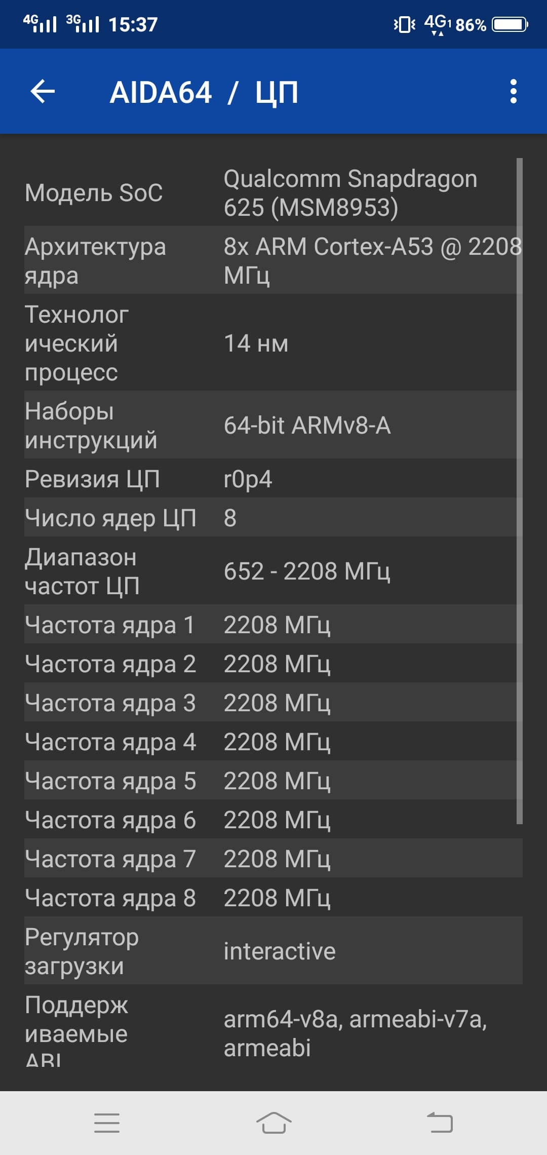 - SoC Qualcomm Snapdragon 626 (MSM8953Pro), 8 ядер ARM Cortex-A53 @2,2 ГГц