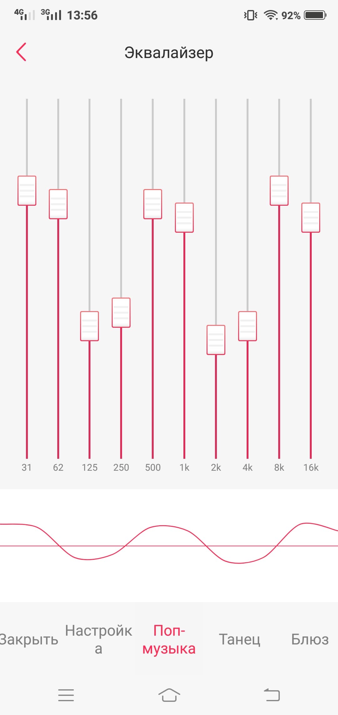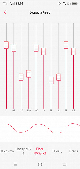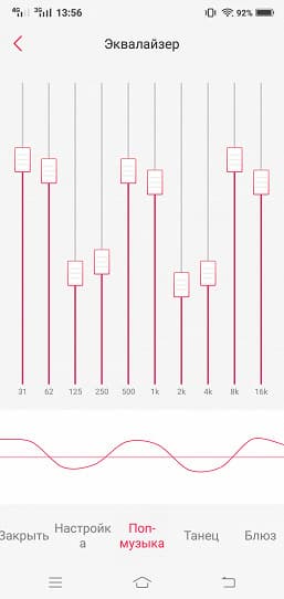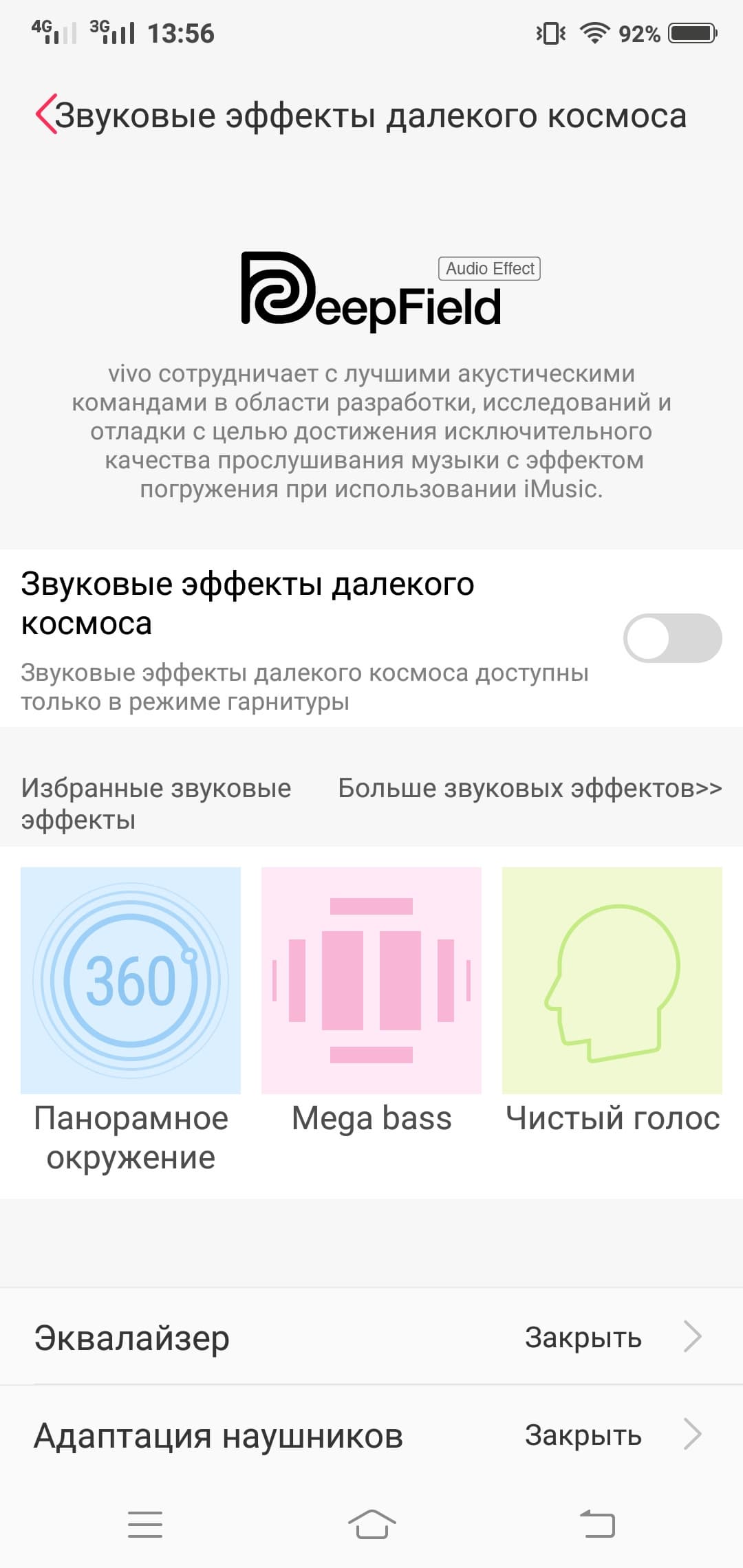 В плане звучания Vivo V9 ничего особенного не демонстрирует. И в наушниках, и выдаваемый громкоговорителем звук довольно простой, звонкий, громкий, чистый, но без заметного присутствия низких частот. Ручных настроек много, есть 10-полосный эквалайзер, имеется даже набор пресетов для подключения определенных моделей наушников. Интересен режим караоке, который позволяет слышать свой голос в наушниках (с приложением WeSing).