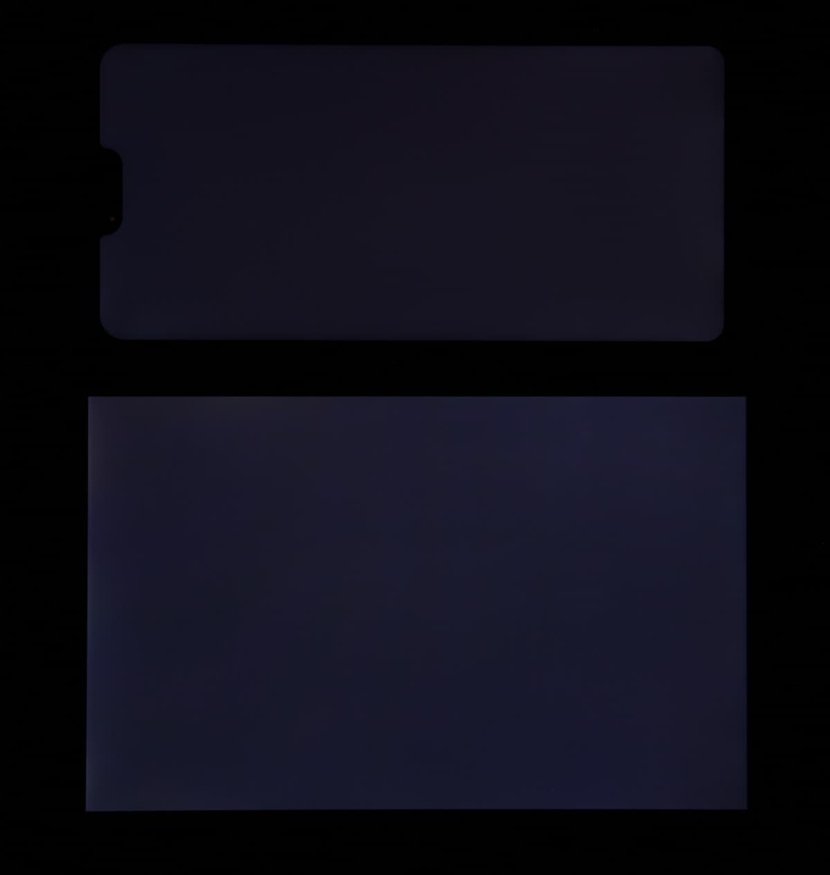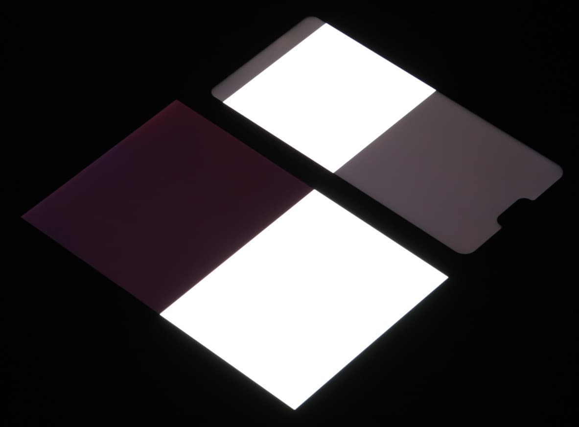 Яркость под углом у экранов уменьшилась (как минимум в 5 раз, исходя из разницы в выдержке), но в случае Vivo V9 падение яркости больше. Черное поле при отклонении по диагонали высветляется сильно и приобретает красноватый оттенок. Фотографии ниже это демонстрируют (яркость белых участков в перпендикулярном плоскости экранов направлении одинаковая!):