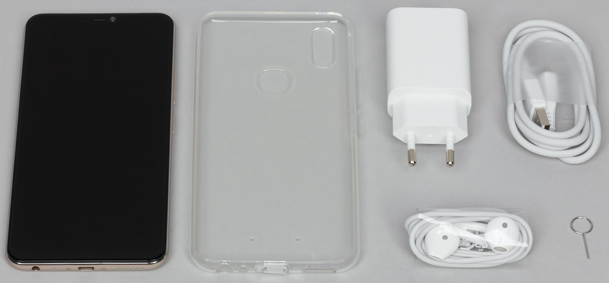 Смартфон поставляется в комплекте с USB-кабелем, сетевым адаптером (5 В 2 А), проводной стереогарнитурой, прозрачным чехлом и ключиком для извлечения карт. На переднем стекле уже наклеена защитная пленка.