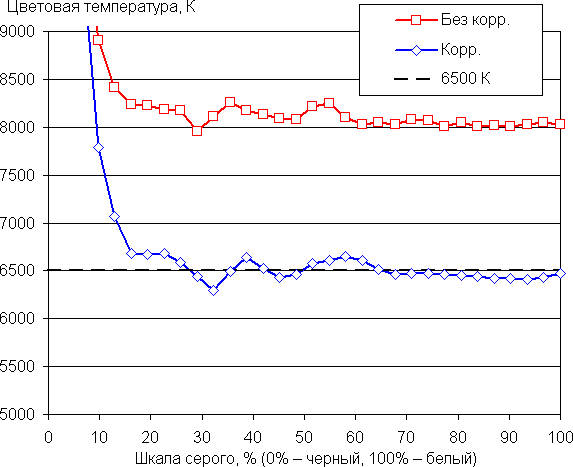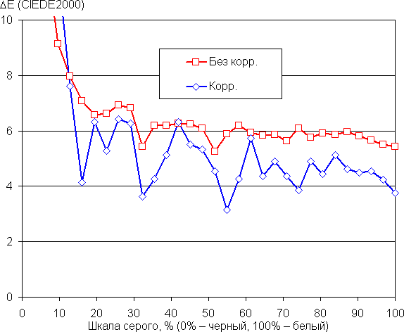 Баланс оттенков на шкале серого средний, так как цветовая температура существенно выше стандартных 6500 К, но отклонение от спектра абсолютно черного тела (ΔE) ниже 10, что для потребительского устройства считается приемлемым показателем (данные, подписанные как Без корр. на графиках ниже). При этом цветовая температура и ΔE мало изменяются от оттенка к оттенку — это положительно сказывается на визуальной оценке цветового баланса. (Самые темные области шкалы серого можно не учитывать, так как там баланс цветов не имеет большого значения, да и погрешность измерений цветовых характеристик на низкой яркости большая.)