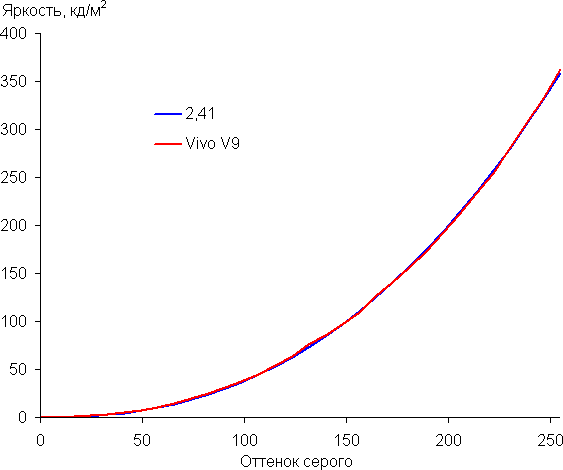 Контрастность (примерно в центре экрана) высокая — порядка 1150:1. Время отклика при переходе черный-белый-черный равно 23 мс (13 мс вкл. + 10 мс выкл.). Переход между полутонами серого 25% и 75% (по численному значению цвета) и обратно в сумме занимает 35 мс. Построенная по 32 точкам с равным интервалом по численному значению оттенка серого гамма-кривая не выявила завала ни в светах, ни в тенях. Показатель аппроксимирующей степенной функции равен 2,41, что выше стандартного значения 2,2, потому и картинка чуть затемнена. При этом реальная гамма-кривая мало отклоняется от степенной зависимости: