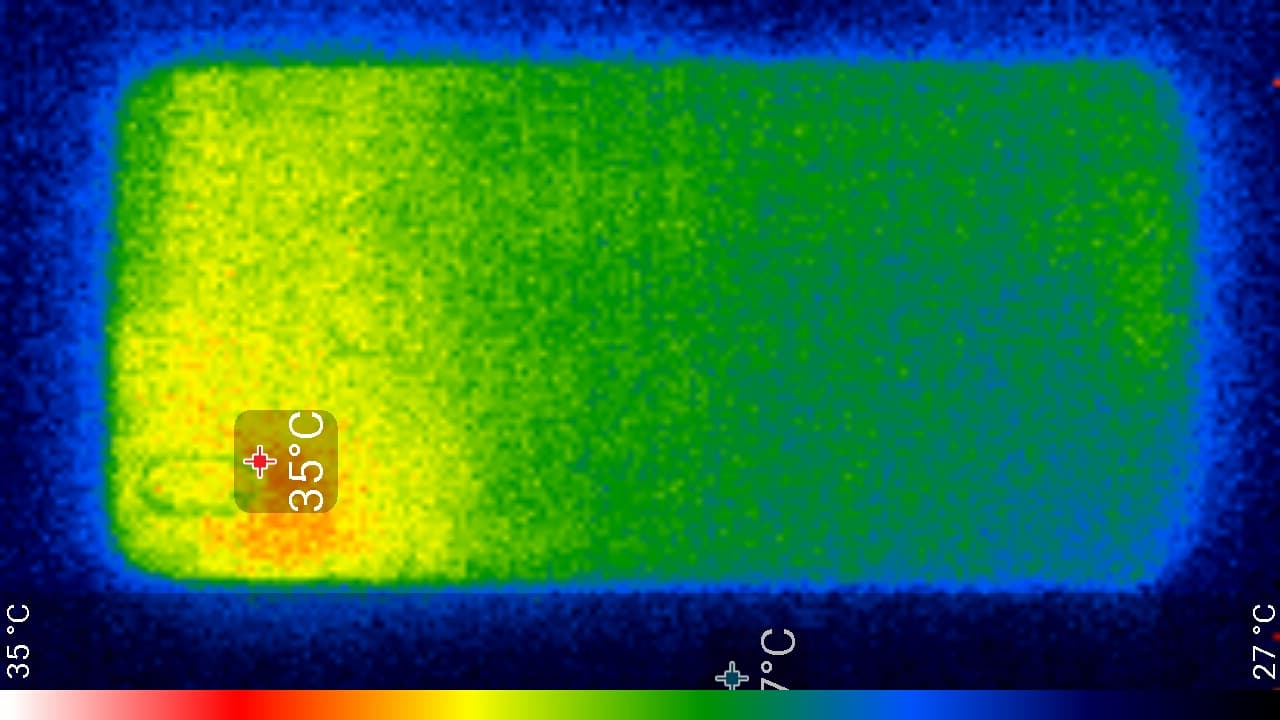 Нагрев локализован в верхней правой части аппарата, что, видимо, соответствует расположению микросхемы SoC. По данным теплокамеры, максимальный нагрев составил всего 35 градусов (при температуре окружающего воздуха в 24 градуса), это относительно немного.