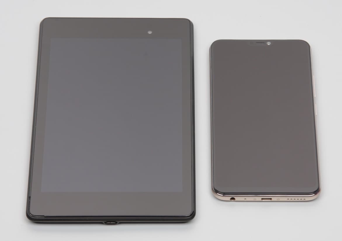 Лицевая поверхность экрана выполнена в виде стеклянной пластины с зеркально-гладкой поверхностью, устойчивой к появлению царапин. Судя по отражению объектов, антибликовые свойства экрана лучше, чем у экрана Google Nexus 7 (2013) (далее просто Nexus 7). Для наглядности приведем фотографию, на которой в выключенных экранах отражается белая поверхность (слева — Nexus 7, справа — Vivo V9, далее их можно различать по размеру):