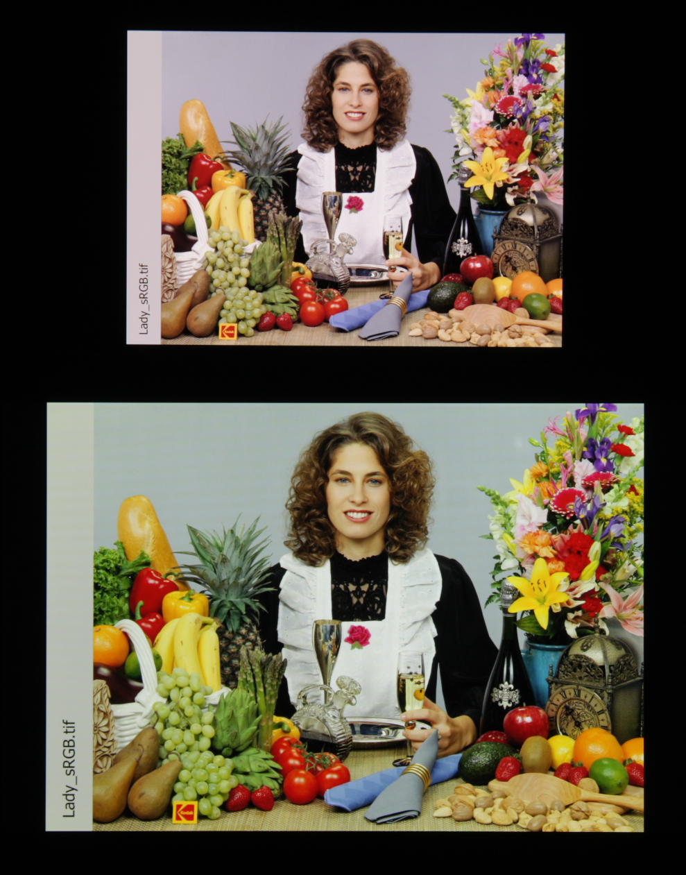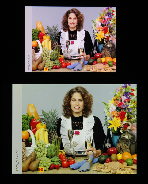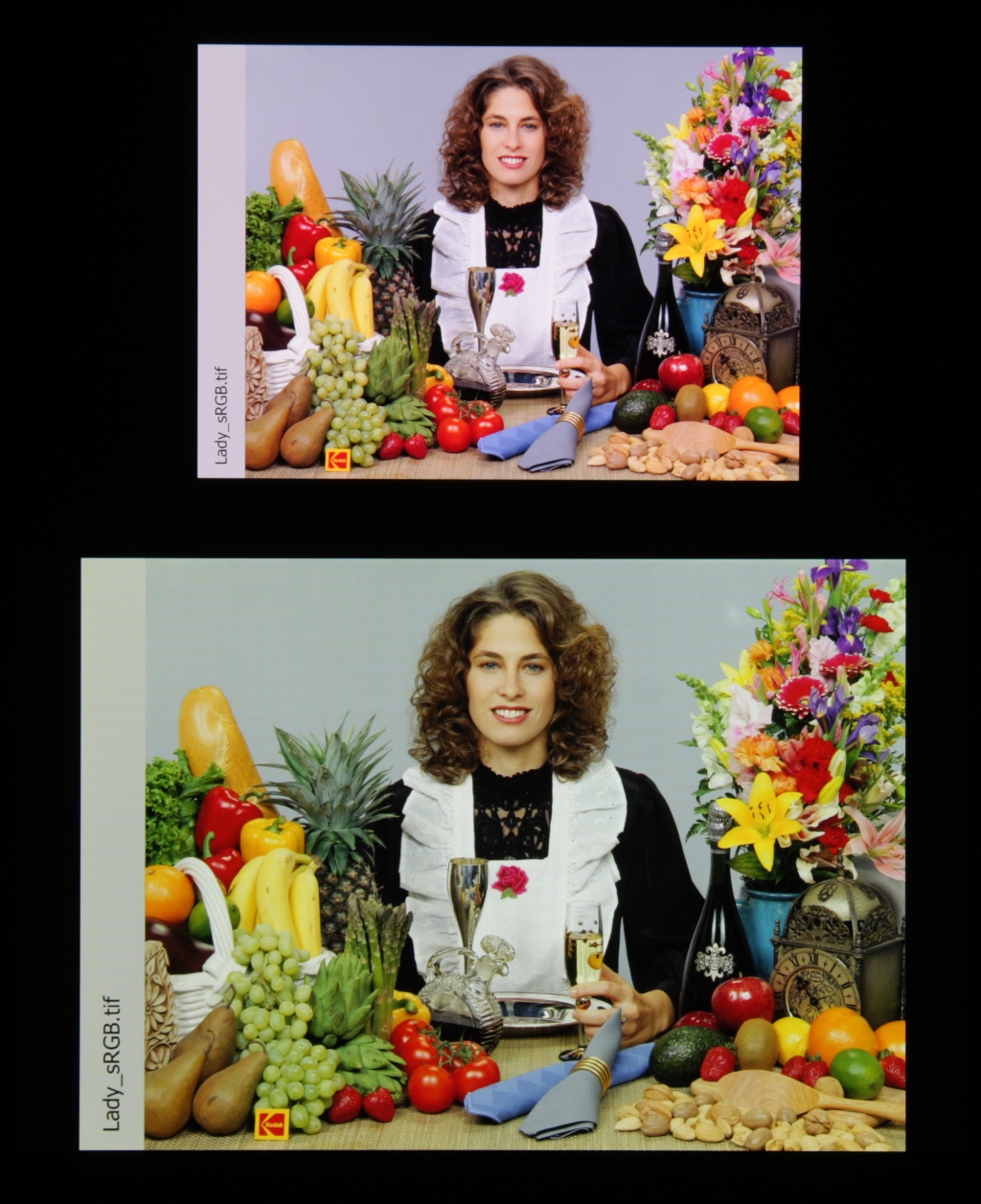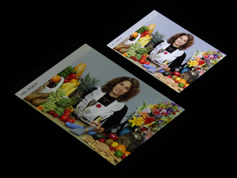 Согласно визуальной оценке, цвета у тестируемого экрана более-менее естественные, а цветовой баланс экранов немного различается. Напомним, что фотография не может служить надежным источником сведений о качестве цветопередачи и приводится только для условной наглядной иллюстрации. В частности, выраженный красноватый оттенок белого и серого полей, присутствующий на фотографиях тестируемого экрана, при перпендикулярном взгляде визуально отсутствует, что подтверждается аппаратными тестами с помощью спектрофотометра. Причина в том, что спектральная чувствительность матрицы фотоаппарата неточно совпадает с этой характеристикой человеческого зрения.