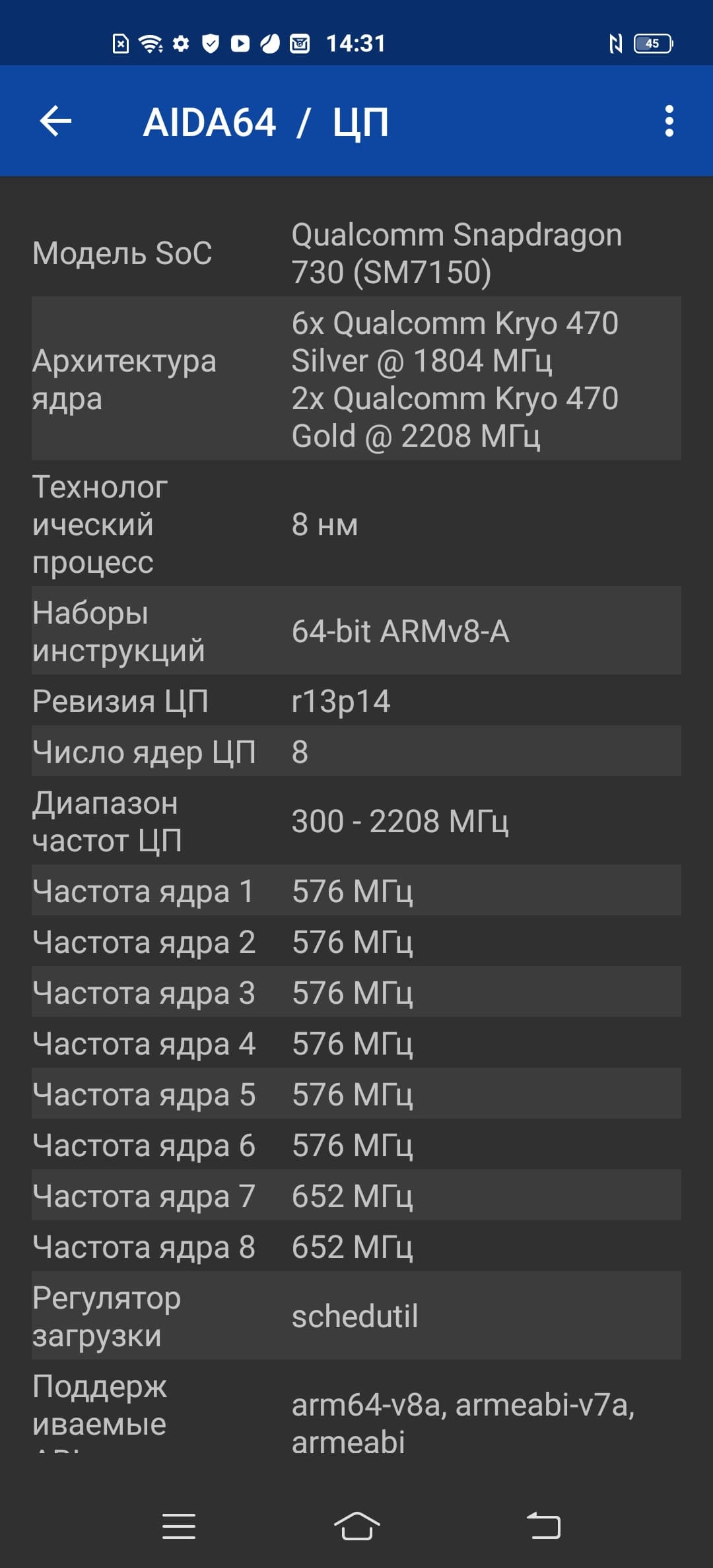 - SoC Qualcomm SDM765 Snapdragon 730, 8 ядер (2×Kryo 470 Gold @2,2 ГГц + 6×Kryo 470 Silver @1,8 ГГц)