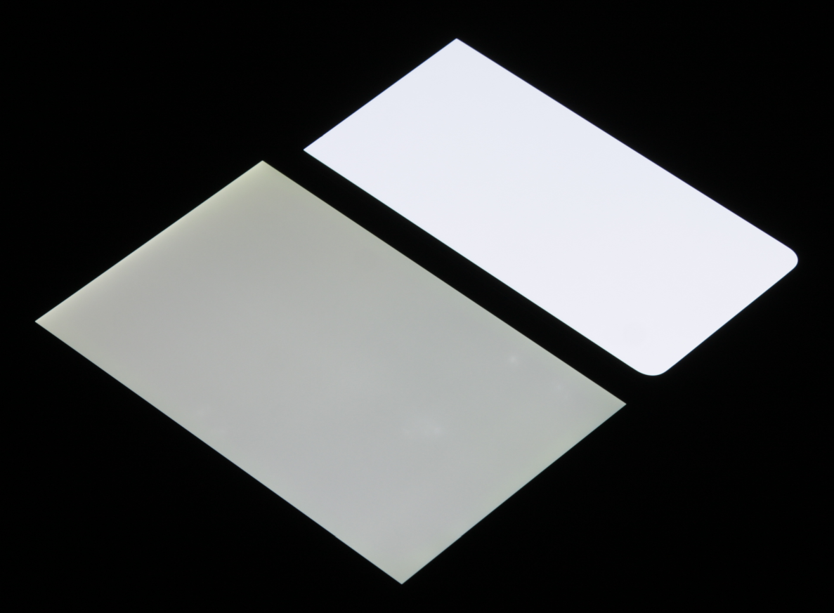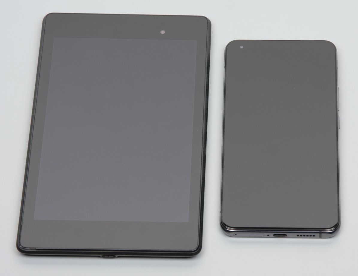 Лицевая поверхность экрана выполнена в виде стеклянной пластины с зеркально-гладкой поверхностью, устойчивой к появлению царапин. Судя по отражению объектов, антибликовые свойства экрана не хуже, чем у экрана Google Nexus 7 (2013) (ниже просто Nexus 7). Для наглядности приведем фотографию, на которой в выключенных экранах отражается белая поверхность (слева — Nexus 7, справа — vivo X50, далее их можно различать по размеру):