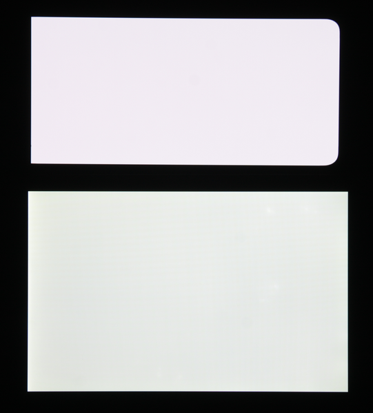 Экран характеризуется великолепными углами обзора. Правда, белый цвет при отклонении даже на небольшие углы приобретает поочередно едва заметный сине-зеленый или розоватый оттенок, но черный цвет остается просто черным под любыми углами. Он настолько черный, что параметр контрастности в данном случае просто неприменим. Для сравнения приведем фотографии, на которых на экраны vivo X50 и второго участника выведены одинаковые изображения, при этом яркость экранов изначально установлена примерно на 200 кд/м², а цветовой баланс на фотоаппарате принудительно переключен на 6500 К.