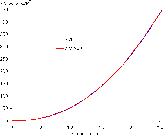 Построенная по 32 точкам с равным интервалом по численному значению оттенка серого гамма-кривая не выявила завала ни в тенях, ни в светах. Показатель аппроксимирующей степенной функции равен 2,26, что немного выше стандартного значения 2,2, при этом реальная гамма-кривая чуть-чуть отклоняется от степенной зависимости: