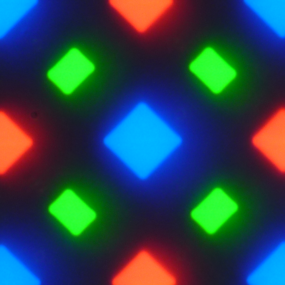 В этом экране используется матрица AMOLED — активная матрица на органических светодиодах. Полноцветное изображение создается с помощью субпикселей трех цветов — красного (R), зеленого (G) и синего (B), но красных и синих субпикселей в два раза меньше, что можно обозначить как RGBG. Это подтверждается фрагментом микрофотографии: