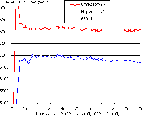Даже в случае отсутствия коррекции баланс оттенков на шкале серого в случае профиля Нормальный режим приемлемый, так как цветовая температура не сильно выше стандартных 6500 К, а отклонение от спектра абсолютно черного тела (ΔE) ниже 2 единиц, что для потребительского устройства считается отличным показателем. При этом цветовая температура и ΔE мало изменяются от оттенка к оттенку — это положительно сказывается на визуальной оценке цветового баланса. В случае профиля Стандартный режим цветовая температура уже существенно выше 6500 К: