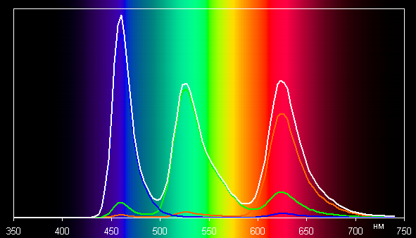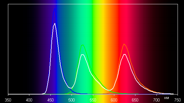 Без коррекции (вариант Яркий режим) спектры компонент (то есть спектры чистых красного, зеленого и синего цветов) очень хорошо разделены: