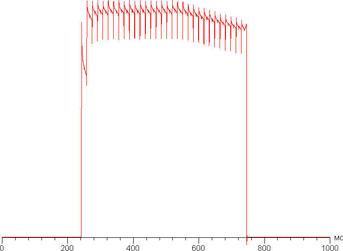 Переключение состояния элементов матрицы выполняется практически мгновенно, но на фронте включения (и реже — выключения) может присутствовать ступенька шириной примерно 17 мс (при частоте обновления экрана 60 Гц). Например, так выглядит зависимость яркости от времени при переходе от черного к белому и обратно: