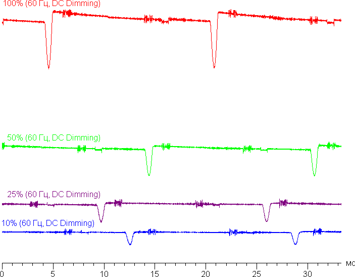 Видно, что на высокой и средней яркости частота модуляции увеличилась в 1,5 раза, а на низкой яркости характер модуляции не изменился.