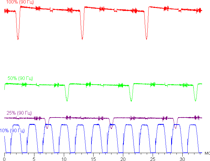 Видно, что на максимальной и средней яркости амплитуда модуляции небольшая, в итоге видимого мерцания нет. Однако при сильном понижении яркости появляется модуляция с большой относительной амплитудой, ее наличие уже можно увидеть в тесте на присутствие стробоскопического эффекта или просто при быстром движении глаз. В зависимости от индивидуальной чувствительности такое мерцание может вызывать повышенную утомляемость. Впрочем, фаза модуляции различается по площади экрана, поэтому негативный эффект от мерцания снижен.