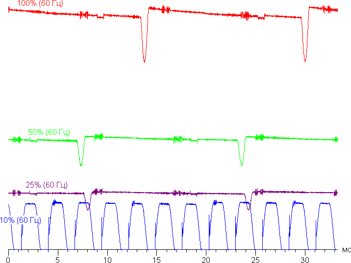 На любом уровне яркости присутствует значимая модуляция с частотой 61,5, 92,25 или 369 Гц. На рисунке ниже приведены зависимости яркости (вертикальная ось) от времени (горизонтальная ось) для нескольких значений настройки яркости. Сначала для режима с частотой обновления «60 Гц»:
