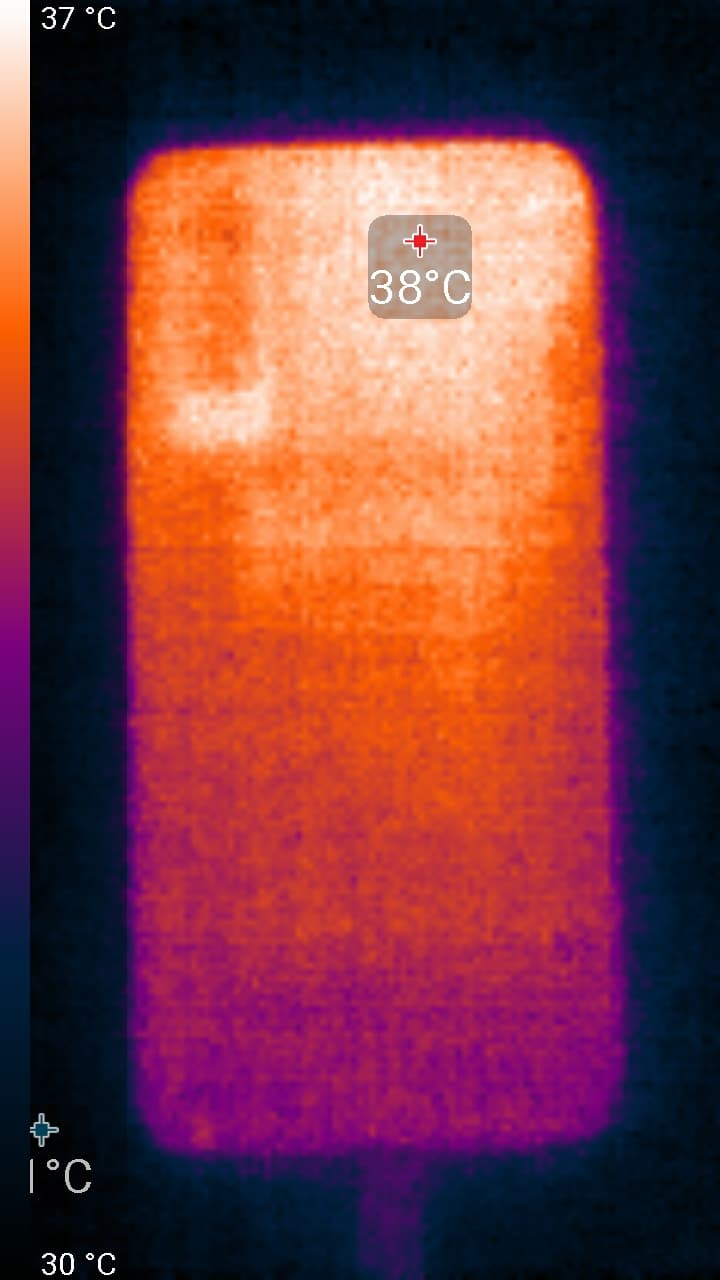 Нагрев больше в верхней правой части аппарата, что, видимо, соответствует расположению микросхемы SoC. По данным теплокамеры, максимальный нагрев составил 38 градусов (при температуре окружающего воздуха в 24 градуса), это не очень много.
