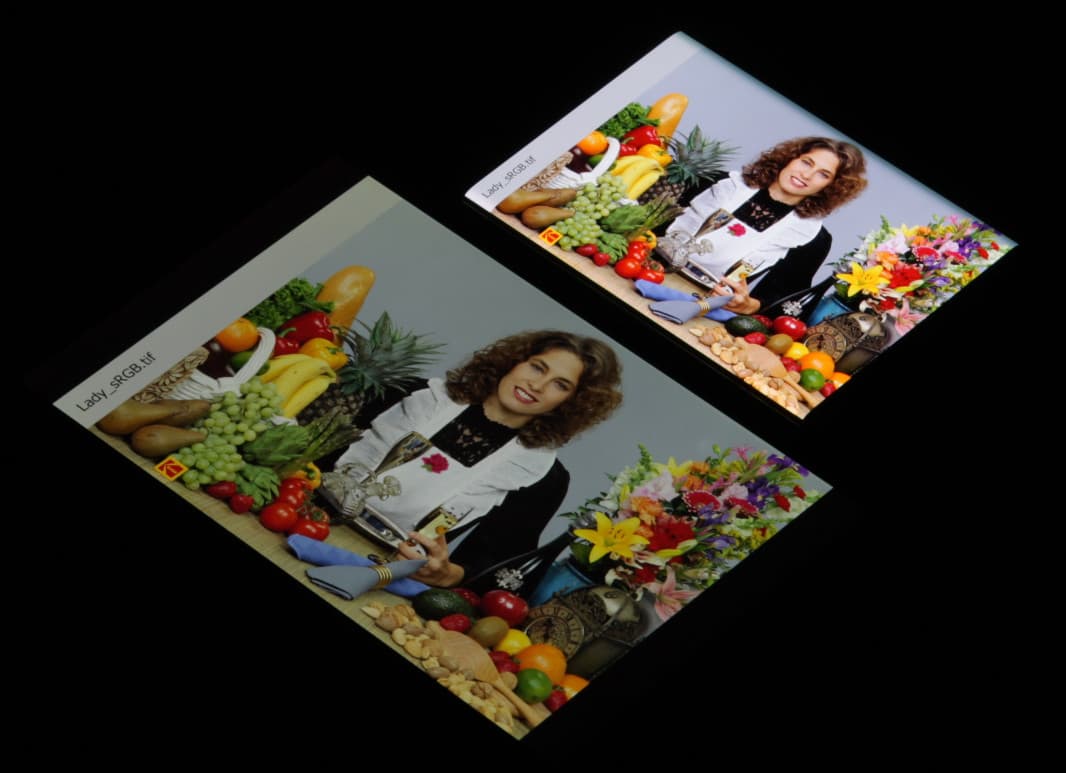 Согласно визуальной оценке, цвета у тестируемого экрана более-менее естественные, а цветовой баланс экранов немного различается. Напомним, что фотография не может служить надежным источником сведений о качестве цветопередачи и приводится только для условной наглядной иллюстрации. В частности, выраженный красноватый оттенок белого и серого полей, присутствующий на фотографиях тестируемого экрана, при перпендикулярном взгляде визуально отсутствует, что подтверждается аппаратными тестами с помощью спектрофотометра. Причина в том, что спектральная чувствительность матрицы фотоаппарата неточно совпадает с этой характеристикой человеческого зрения. Заметим, что в данном случае картинка занимает в высоту (при ландшафтной ориентации экрана) всю доступную для вывода изображения область и заходит на загнутые края экрана, что приводит к легкому затемнению и искажению цвета. Также на свету эти области почти всегда бликуют, что еще больше мешает при просмотре изображений, выведенных на весь экран. И даже картинка фильмов с соотношением сторон 16:9 заходит на загибы, что мешает при просмотре кино.