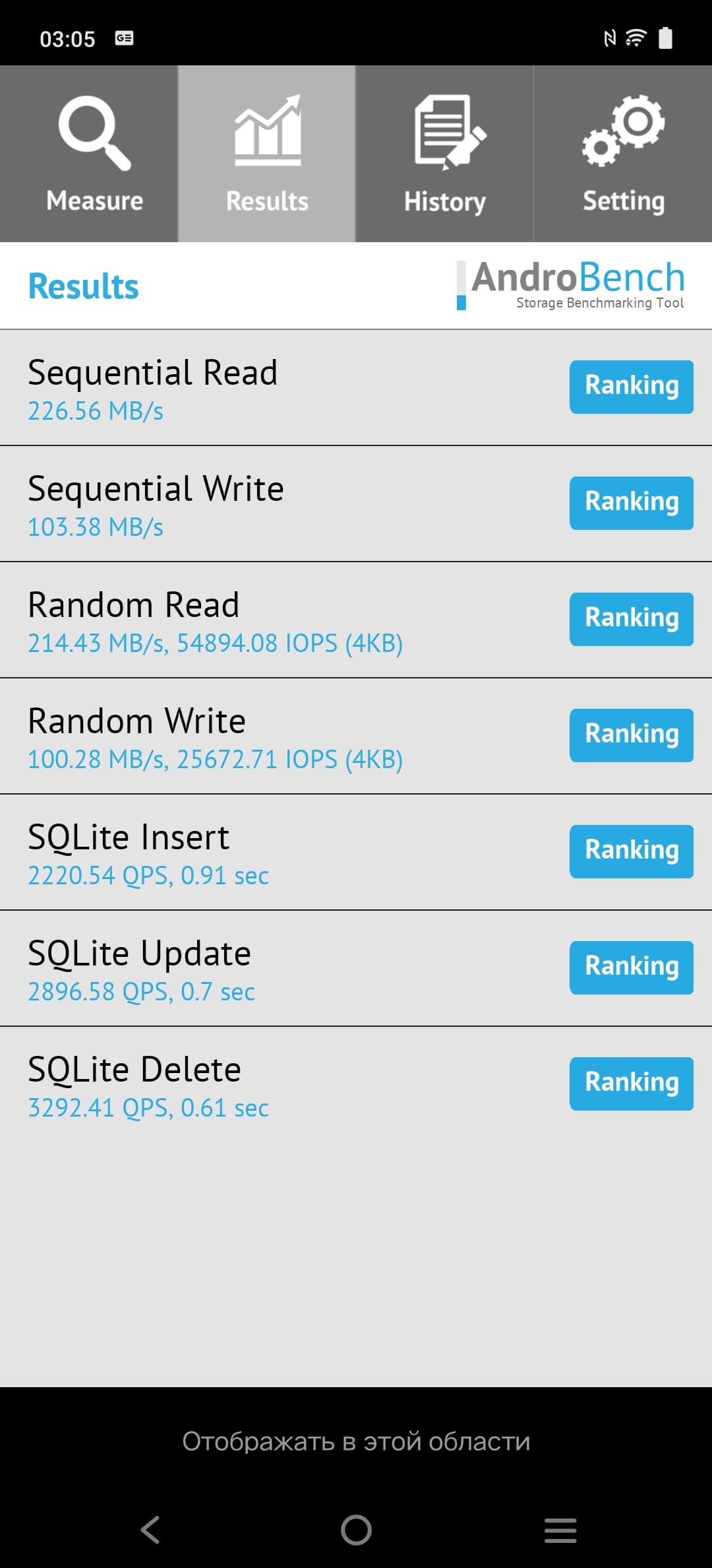 Результаты теста AndroBench на скорость работы с памятью: