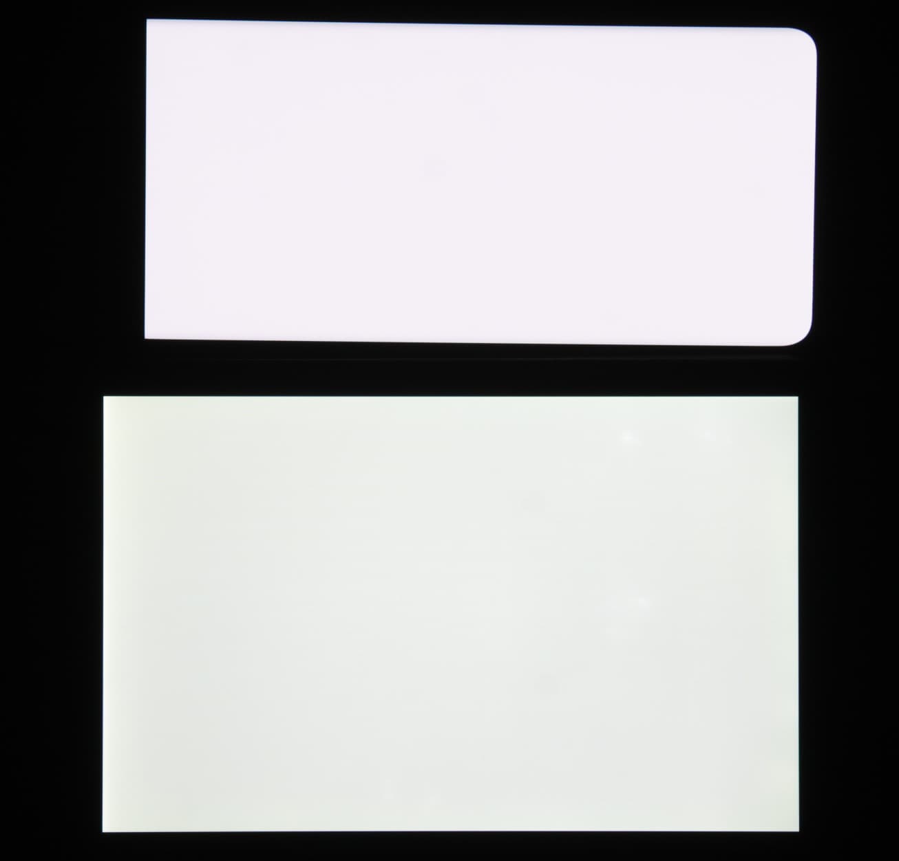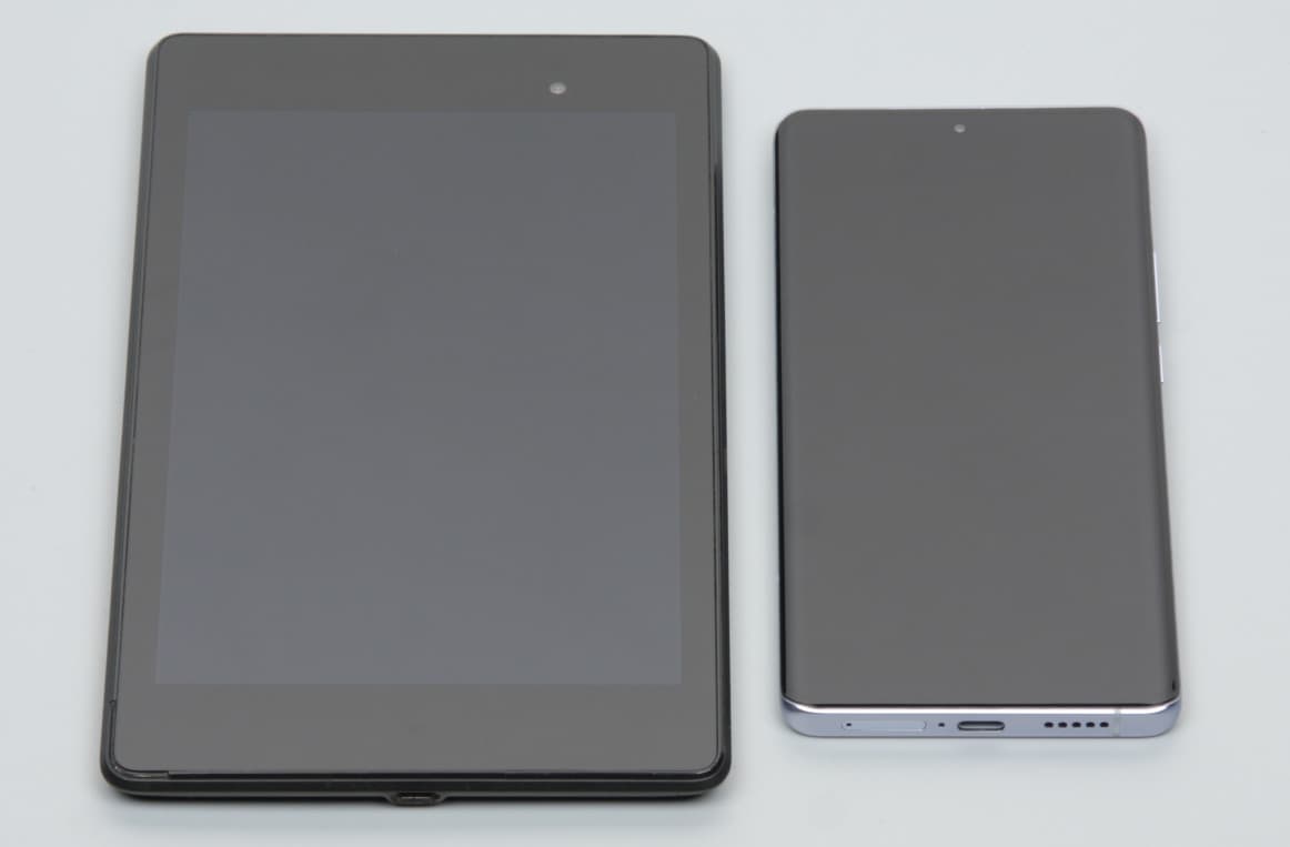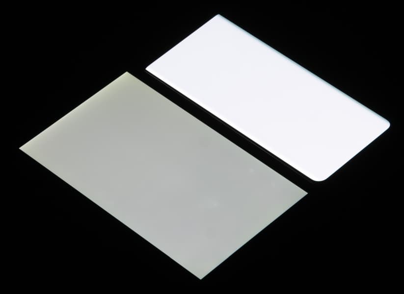 Лицевая поверхность экрана выполнена в виде стеклянной пластины с зеркально-гладкой поверхностью, устойчивой к появлению царапин. Судя по отражению объектов, антибликовые свойства экрана не хуже, чем у экрана Google Nexus 7 (2013) (ниже просто Nexus 7). Для наглядности приведем фотографию, на которой в выключенных экранах отражается белая поверхность (слева — Nexus 7, справа — Vivo X60 Pro, далее их можно различать по размеру):