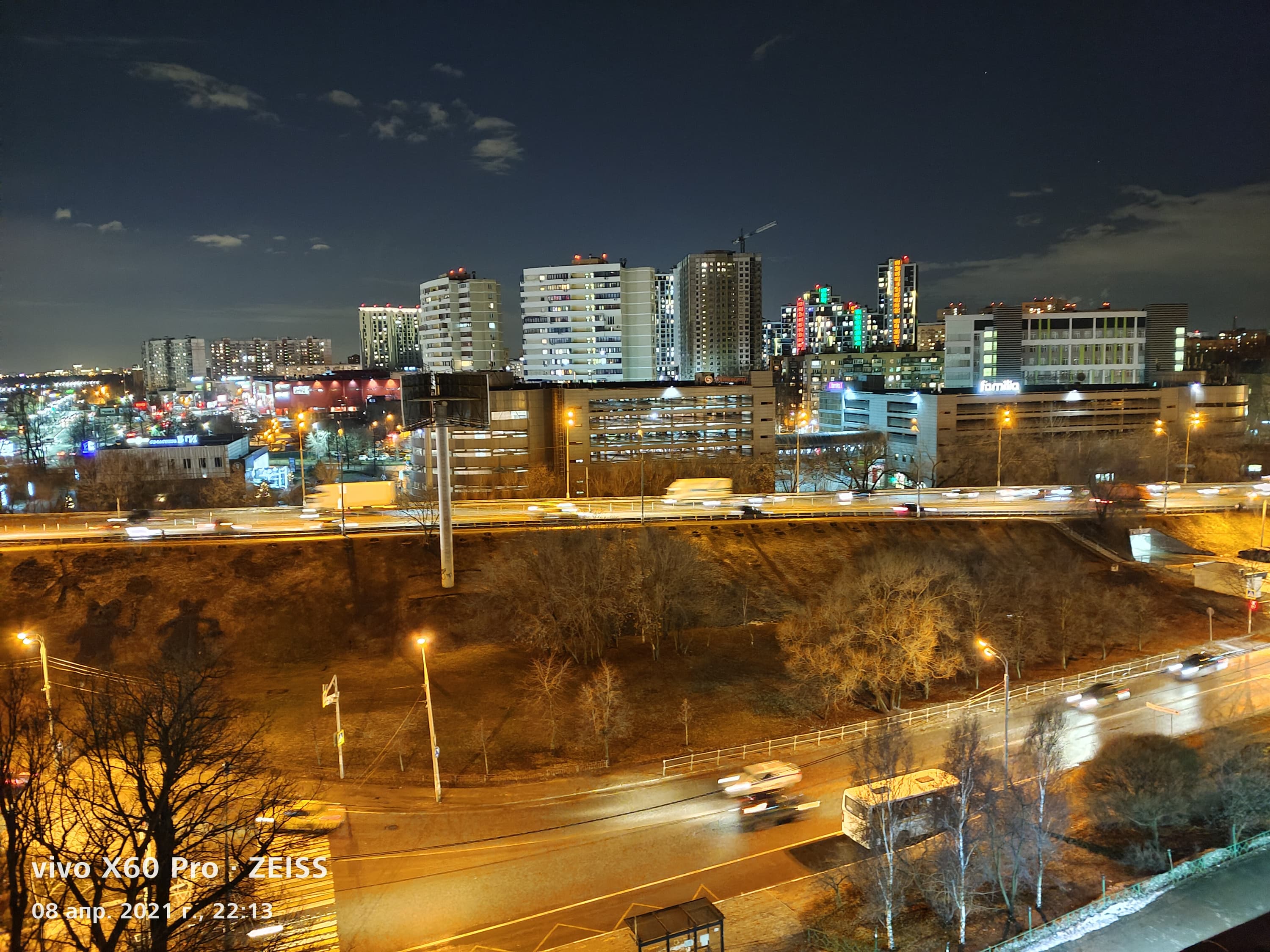В ночном режиме можно снимать на основную и на широкоугольную камеры. За счет продвинутой стабилизации есть возможность снимать на длинной выдержке, получая достаточно чистую яркую картинку. Предусмотрены специальные ночные режимы съемки звездного неба (которое в городах все равно не увидеть из-за светового шума) и даже Луны. В последнем можно поместить Луну в круге, который загорится оранжевым, тогда Луна приближается к объекту съемки.