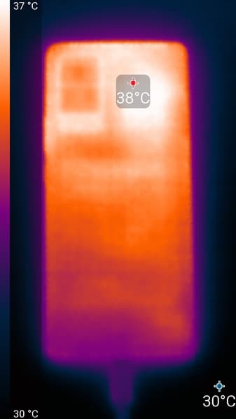 Нагрев больше в верхней части аппарата, что, видимо, соответствует расположению микросхемы SoC. По данным теплокамеры, максимальный нагрев составил 38 градусов (при температуре окружающего воздуха в 24 градуса), это не очень много.