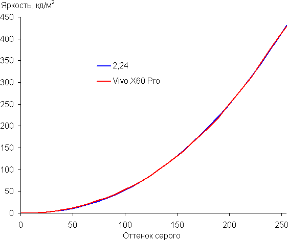 Напомним, что в случае OLED-экранов яркость фрагментов изображения динамично меняется в соответствии с характером выводимого изображения — уменьшается для светлых в целом изображений. В итоге полученная зависимость яркости от оттенка (гамма-кривая), скорее всего, немного не соответствует гамма-кривой статичного изображения, так как измерения проводились при последовательном выводе оттенков серого почти на весь экран.