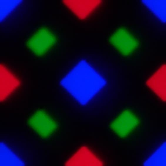 В этом экране используется матрица AMOLED — активная матрица на органических светодиодах. Полноцветное изображение создается с помощью субпикселей трех цветов — красного (R), зеленого (G) и синего (B), но красных и синих субпикселей в два раза меньше, что можно обозначить как RGBG. Это подтверждается фрагментом микрофотографии: