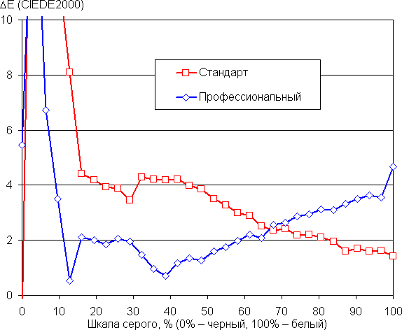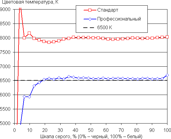 Даже в случае отсутствия коррекции баланс оттенков на шкале серого в случае профиля Профессиональный приемлемый, так как цветовая температура близка к стандартным 6500 К, а отклонение от спектра абсолютно черного тела (ΔE) ниже 10 единиц, что для потребительского устройства считается приемлемым показателем. При этом цветовая температура и ΔE мало изменяются от оттенка к оттенку — это положительно сказывается на визуальной оценке цветового баланса. В случае профиля Стандарт цветовая температура уже существенно выше 6500 К:
