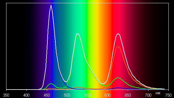 Без коррекции (вариант Яркий) спектры компонент (то есть спектры чистых красного, зеленого и синего цветов) очень хорошо разделены: