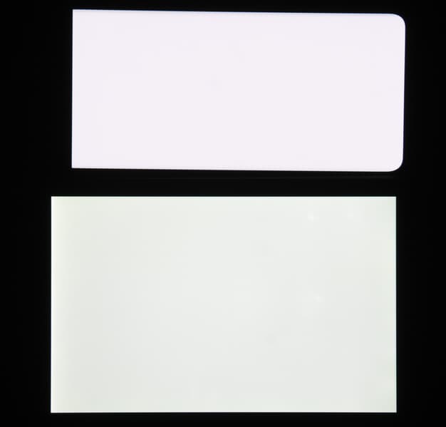 Экран характеризуется великолепными углами обзора. Белый цвет при отклонении от перпендикуляра к экрану меняет оттенок незначительно, что для OLED-экранов редкость. Черный цвет, разумеется, остается просто черным под любыми углами. Он настолько черный, что параметр контрастности в данном случае просто неприменим. Для сравнения приведем фотографии, на которых на экраны Vivo X60 Pro и второго участника выведены одинаковые изображения, при этом яркость экранов изначально установлена примерно на 200 кд/м², а цветовой баланс на фотоаппарате принудительно переключен на 6500 К.