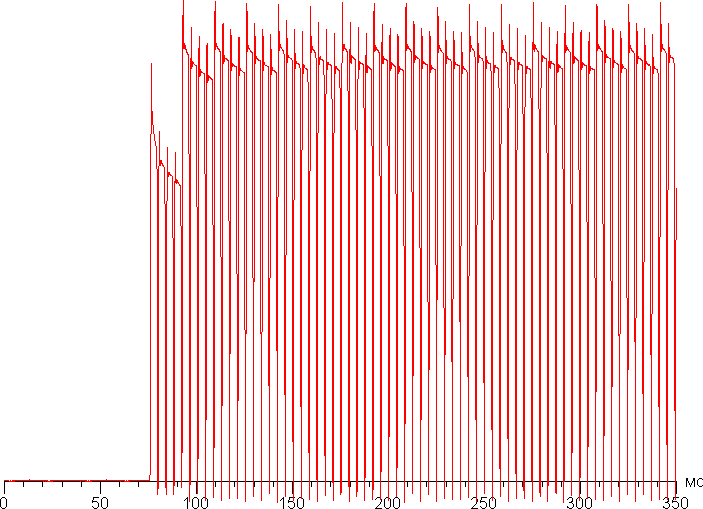 Переключение состояния элементов матрицы выполняется практически мгновенно, но на фронте включения (и реже — выключения) может присутствовать ступенька шириной примерно 17 мс (при частоте обновления экрана 60 Гц). Например, так выглядит зависимость яркости от времени при переходе от черного к белому и обратно: