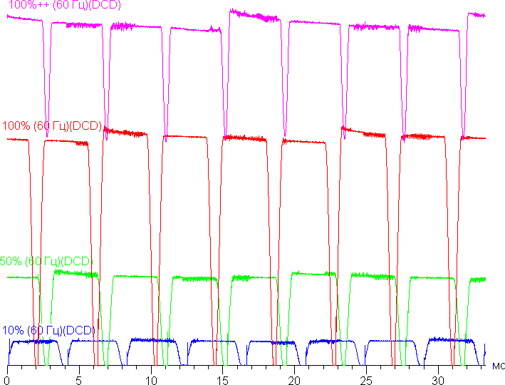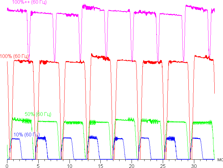 На любом уровне яркости присутствует значимая модуляция с частотой 241 Гц. На рисунке ниже приведены зависимости яркости (вертикальная ось) от времени (горизонтальная ось) для нескольких значений настройки яркости. Сначала для режима с частотой обновления 60 Гц: