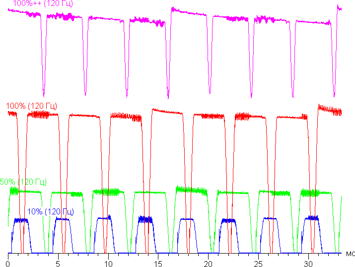 Видно, что на максимальной и средней яркости амплитуда модуляции небольшая и/или скважность низкая, поэтому видимого мерцания нет. Однако при сильном понижении яркости появляется модуляция с большой относительной амплитудой и высокой скважностью, наличие модуляции уже можно увидеть в тесте на присутствие стробоскопического эффекта или просто при быстром движении глаз. В зависимости от индивидуальной чувствительности такое мерцание может вызывать повышенную утомляемость. Впрочем, фаза модуляции различается по площади экрана, поэтому негативный эффект от мерцания снижен.