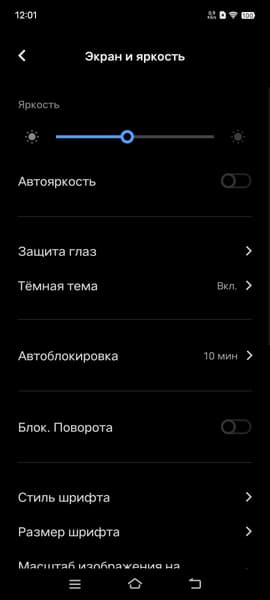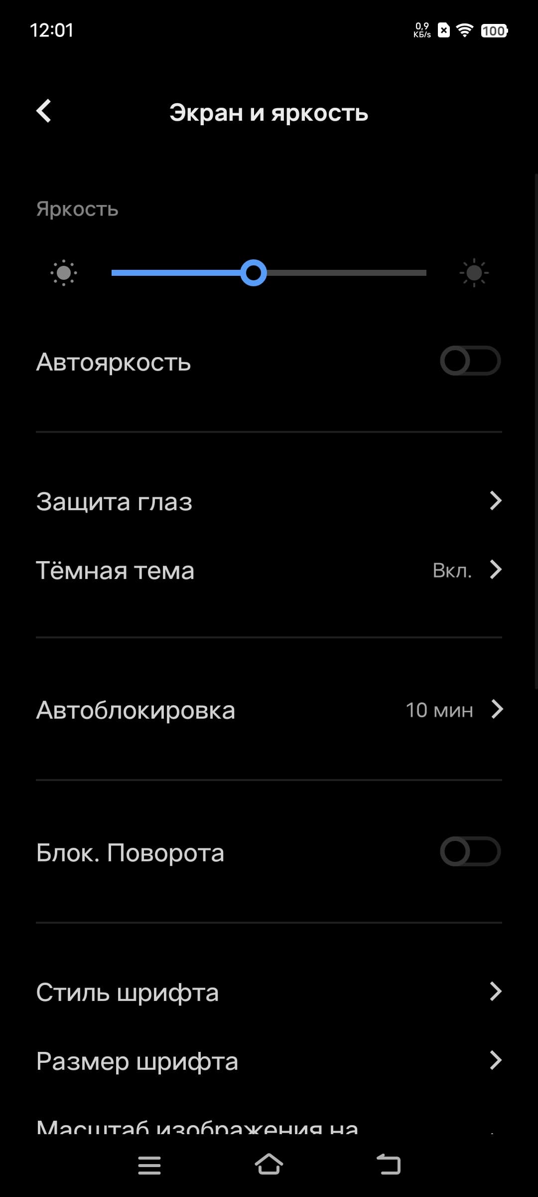 При ручном управлении яркостью и при выводе белого поля во весь экран максимальное значение яркости составило примерно 470 кд/м² в обычных условиях, на очень ярком свету оно может повышаться до 1070 кд/м² (иногда, видимо из-за нагрева, повышается только до 550 кд/м²). Максимальная яркость очень высокая. В данном случае чем меньше площадь белого на экране, тем он светлее, то есть фактическая максимальная яркость белых участков будет почти всегда еще выше. В итоге, учитывая отличные антибликовые свойства, читаемость днем на солнце, должна быть на хорошем уровне, а темная тема не только экономит заряд аккумулятора, но способствует лучшей разборчивости информации на экране в условиях высокой освещенности. Минимальное значение яркости при ручном управлении — 8 кд/м², то есть пониженный уровень яркости без проблем позволяет использовать устройство даже в полной темноте. Есть автоматическая регулировка яркости по датчику освещенности (он расположен под экраном близко к верхнему краю правее центра по горизонтали). В автоматическом режиме при изменении внешних условий освещенности яркость экрана как повышается, так и понижается. Работа этой функции зависит от положения ползунка регулировки яркости: им пользователь может попытаться выставить желаемый уровень яркости в текущих условиях. Если оставить все по умолчанию, то в полной темноте функция автояркости уменьшает яркость до 7 кд/м² (темновато), в условиях освещенного искусственным светом офиса (примерно 550 лк) устанавливает на 90 кд/м² (сойдет), а условно под прямыми лучами солнца повышает до 1070 кд/м² (до максимума, так и нужно). Результат нас не совсем устроил, поэтому в полной темноте мы чуть увеличили яркость, получив в итоге для трех условий, указанных выше, следующие значения: 15, 100 и 1070 кд/м² (идеальное сочетание). Получается, что функция автоподстройки яркости работает адекватно и позволяет пользователю настраивать свою работу под индивидуальные требования.