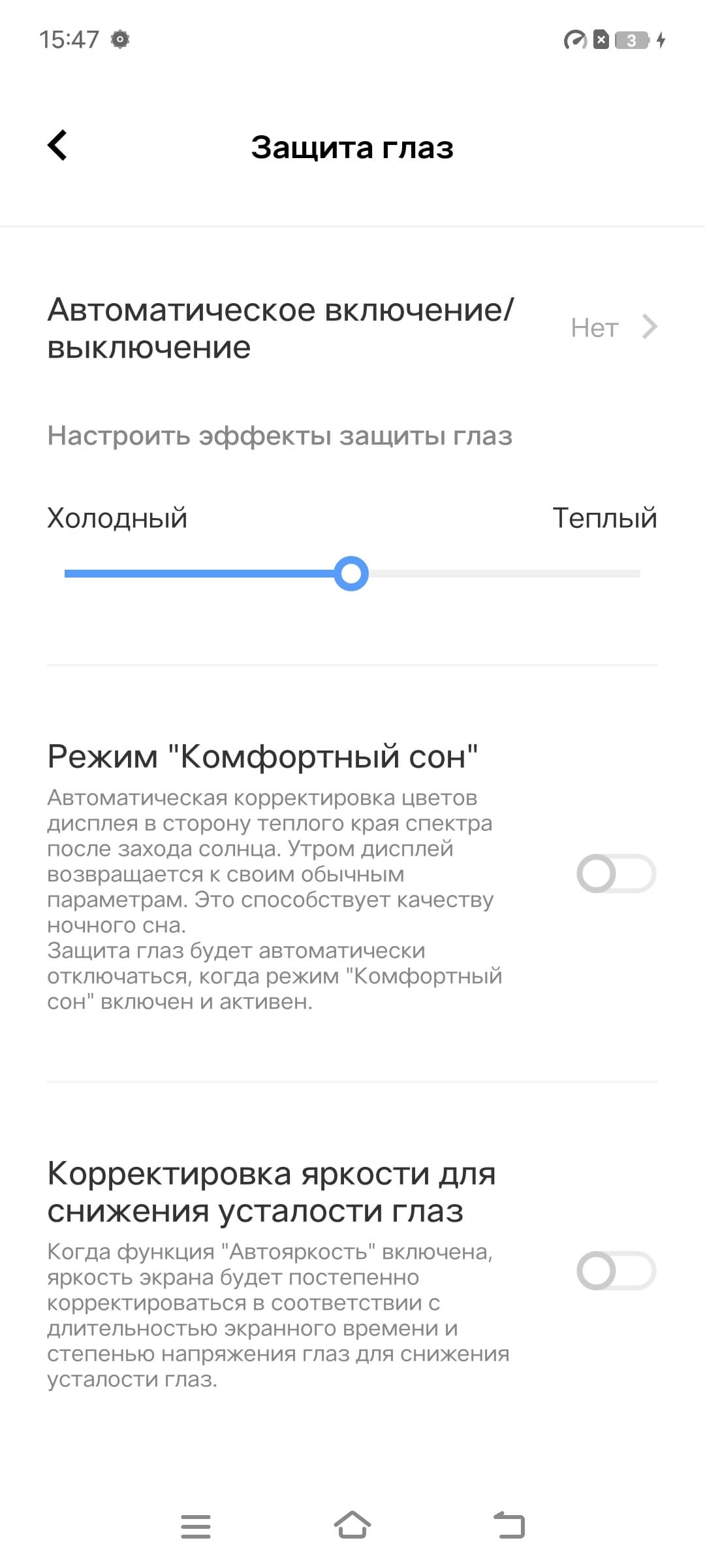 Разумеется, присутствует настройка (Защита глаз), позволяющая снизить интенсивность синей компоненты: