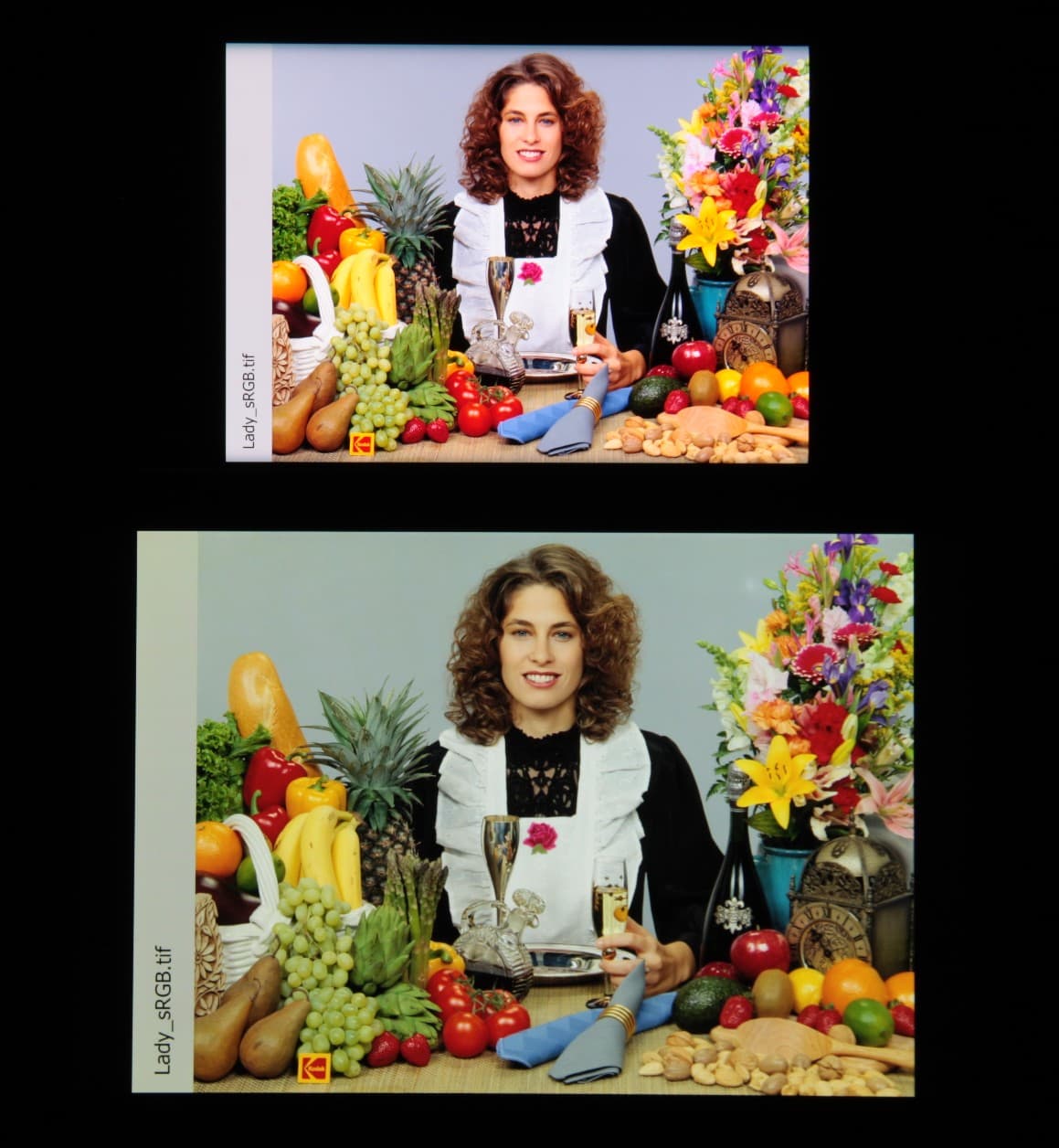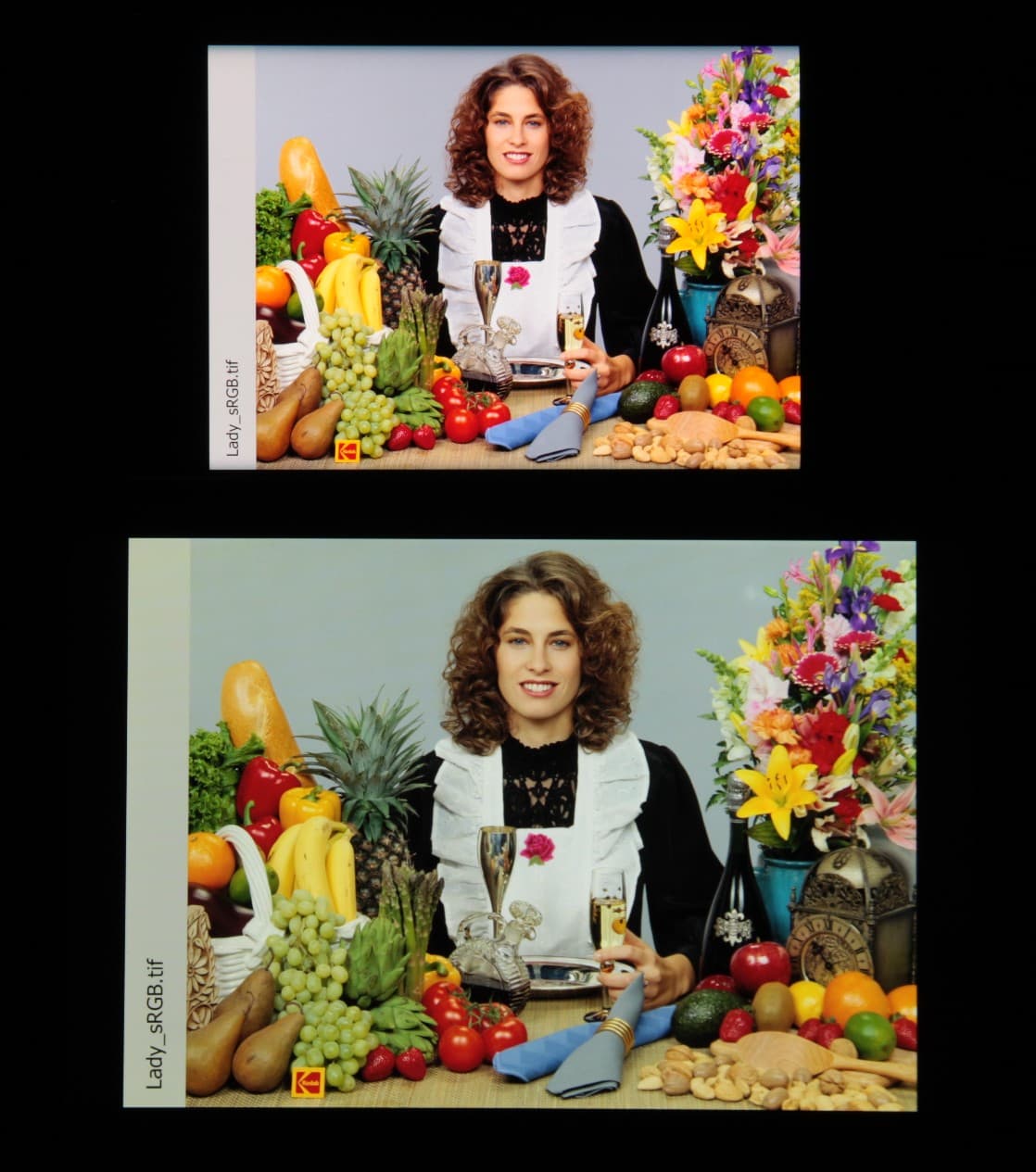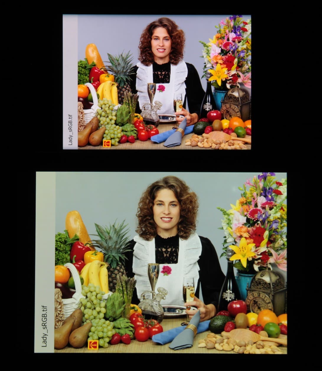 Согласно визуальной оценке, цвета у тестируемого экрана более-менее естественные, а цветовой баланс экранов немного различается. Напомним, что фотография не может служить надежным источником сведений о качестве цветопередачи и приводится только для условной наглядной иллюстрации. В частности, выраженный красноватый оттенок белого и серого полей, присутствующий на фотографиях тестируемого экрана, при перпендикулярном взгляде визуально отсутствует, что подтверждается аппаратными тестами с помощью спектрофотометра. Причина в том, что спектральная чувствительность матрицы фотоаппарата неточно совпадает с этой характеристикой человеческого зрения. Заметим, что в данном случае картинка занимает в высоту (при ландшафтной ориентации экрана) всю доступную для вывода изображения область и заходит на загнутые края экрана, что приводит к легкому затемнению и искажению цвета. Также на свету эти области почти всегда бликуют, что еще больше мешает при просмотре изображений, выведенных на весь экран. И даже картинка фильмов с соотношением сторон 16:9 заходит на загибы, что мешает при просмотре кино.