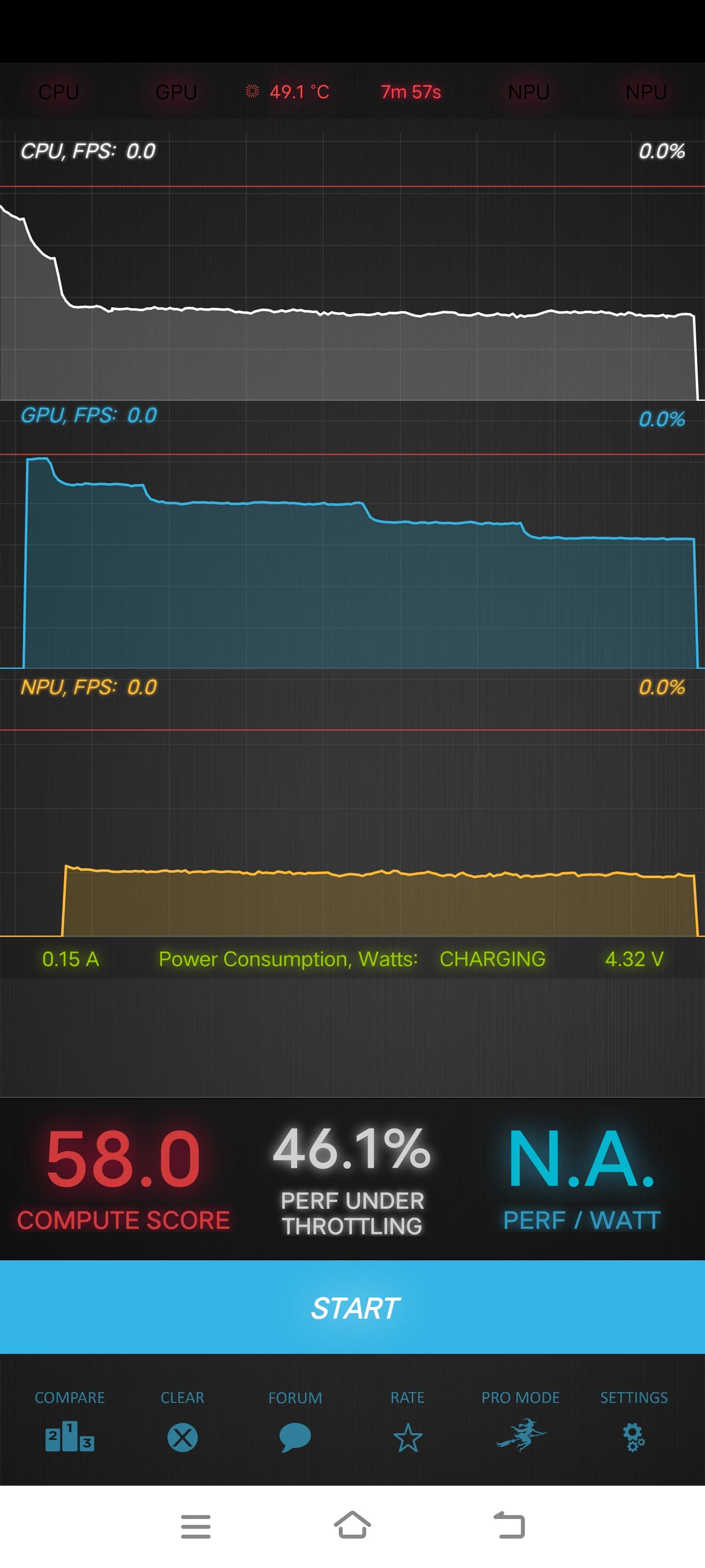 Тест на снижение производительности при нагреве мы проводим с помощью программы Burnout Benchmark, которая позволяет нагружать CPU, GPU и NPU: