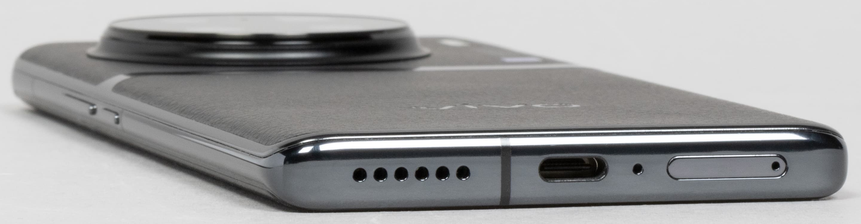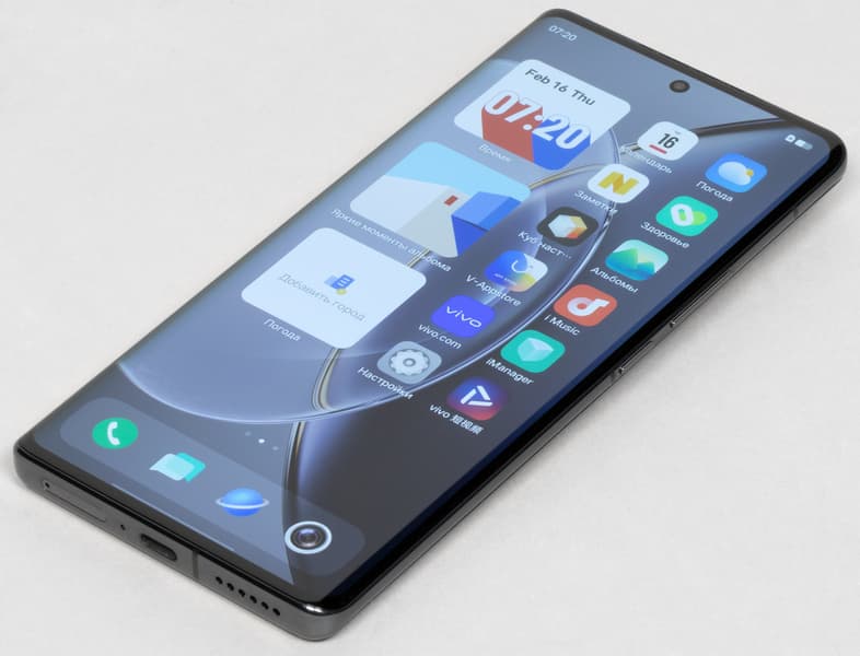 Vivo X90 Pro+ выглядит своеобразно: у него крупный, тяжелый, солидного вида корпус с обтекаемыми формами без плоских панелей и резких переходов. При этом боковые грани не совсем уж закруглены, они еще позволяют более-менее крепко удерживать смартфон в руке. Но сам металл рамки гладкий и скользкий.