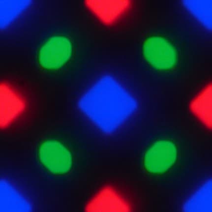 В этом экране используется матрица AMOLED — активная матрица на органических светодиодах. Полноцветное изображение создается с помощью субпикселей трех цветов — красного (R), зеленого (G) и синего (B), но красных и синих субпикселей в два раза меньше, что можно обозначить как RGBG. Это подтверждается фрагментом микрофотографии: