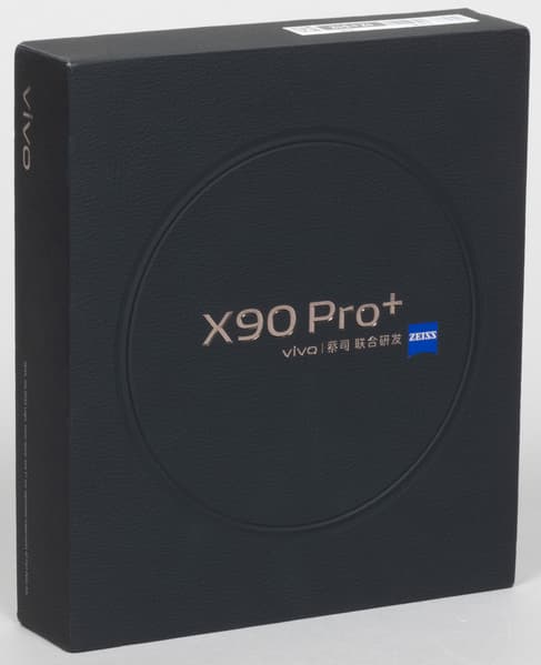 Vivo X90 Pro+ поставляется в нестандартной формы картонной коробке с премиальным оформлением — золотистым тиснением по черным матовым поверхностям.