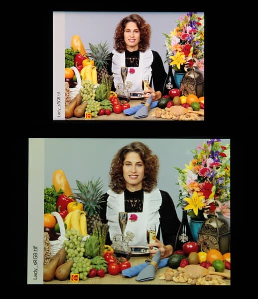 Отметим хорошую равномерность яркости и цветового тона белого поля (за исключением едва видимого затемнения и изменения оттенка к загнутым краям).