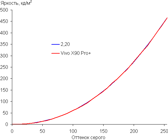 Напомним, что в случае OLED-экранов яркость фрагментов изображения динамично меняется в соответствии с характером выводимого изображения — слегка уменьшается для светлых в целом изображений. В итоге полученная зависимость яркости от оттенка (гамма-кривая), скорее всего, немного не соответствует гамма-кривой статичного изображения, так как измерения проводились при последовательном выводе оттенков серого почти на весь экран.