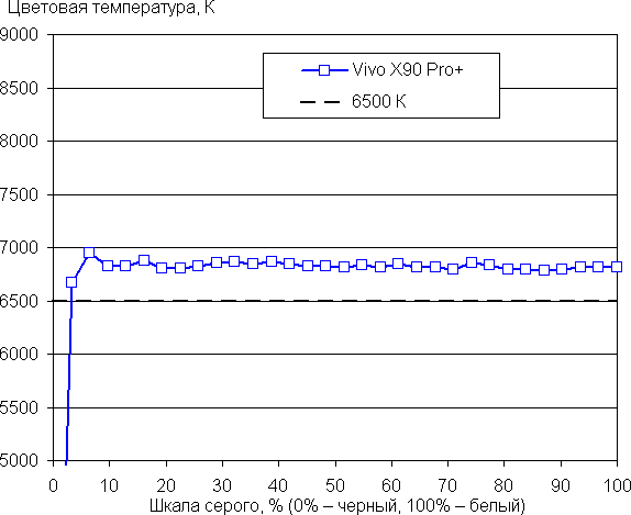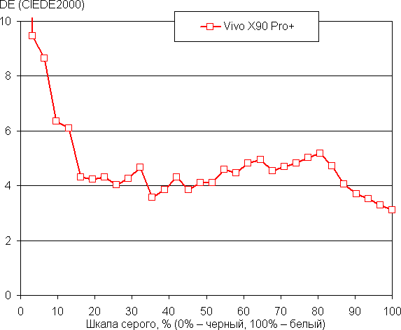 (Самые темные области шкалы серого в большинстве случаев можно не учитывать, так как там баланс цветов не имеет большого значения, да и погрешность измерений цветовых характеристик на низкой яркости большая.)