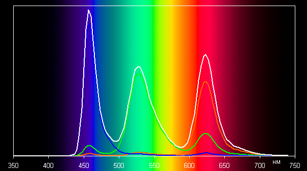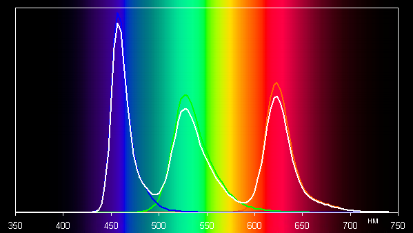 Без коррекции (вариант Ярко) спектры компонент (то есть спектры чистых красного, зеленого и синего цветов) очень хорошо разделены: