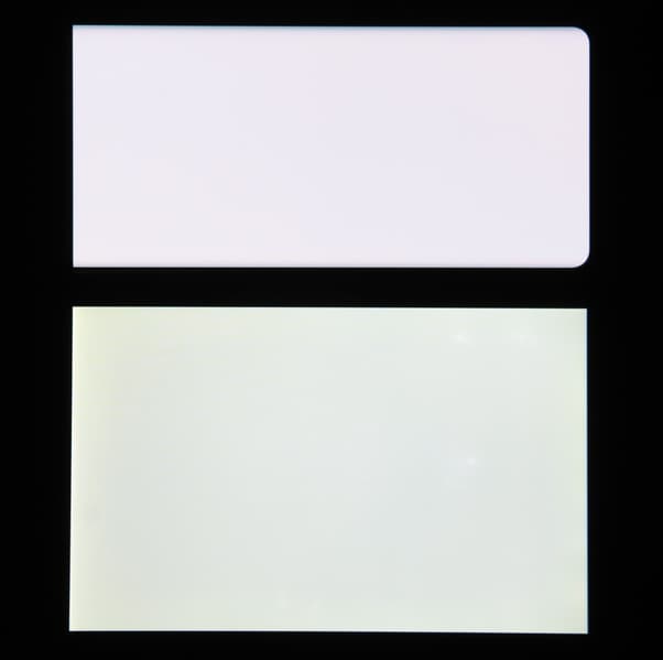 Экран характеризуется великолепными углами обзора. Правда, белый цвет при отклонении на большие углы приобретает легкий сине-зеленый оттенок, но черный цвет остается просто черным под любыми углами. Он настолько черный, что параметр контрастности в данном случае просто неприменим. Для сравнения приведем фотографии, на которых на экраны Vivo X90 Pro+ и второго участника выведены одинаковые изображения, при этом яркость экранов изначально установлена примерно на 200 кд/м², а цветовой баланс на фотоаппарате принудительно переключен на 6500 К.