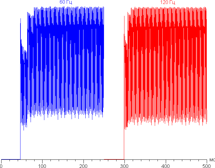 Переключение состояния элементов матрицы выполняется практически мгновенно, но на фронте включения (и реже — выключения) может присутствовать ступенька шириной примерно 17 мс (при частоте обновления экрана 60 Гц) или примерно 8 мс (120 Гц). Например, так выглядит зависимость яркости от времени при переходе от черного к белому и обратно: